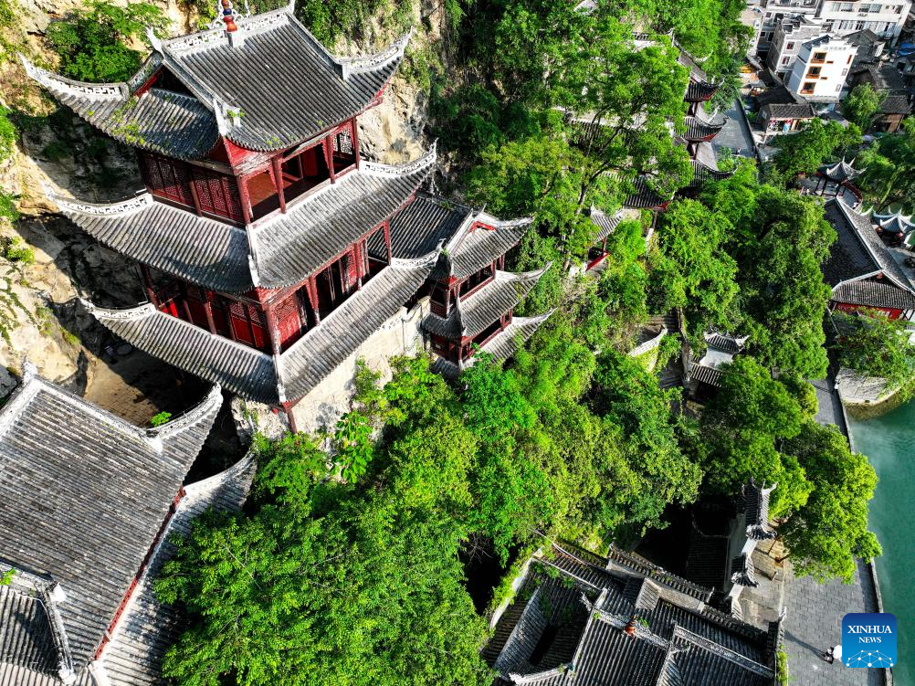 An aerial drone photo taken on May 20, 2025 shows a view of Qinglong Cave Complex built on the cliff in Zhenyuan ancient town in Qiandongnan Miao and Dong Autonomous Prefecture in southwest China's Guizhou Province. The architectural complex, located on a 300-meter-long and 80-meter-high cliff, is a model of the integration of architectural characters between the north and the south of China. (Xinhua/Ou Dongqu)