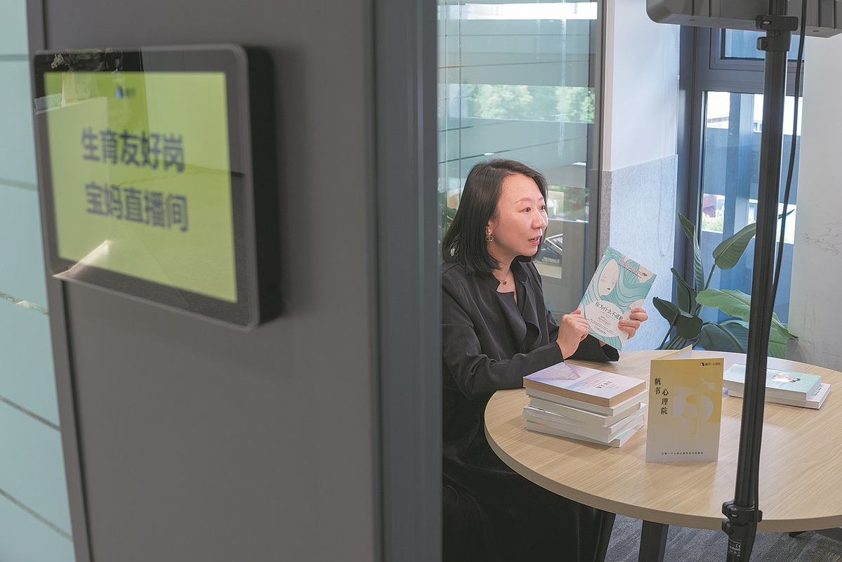 Meng Lei introduces a book via livestreaming in a special room designed for birth-friendly posts at Fanshu App. (Gao Erqiang/China Daily)