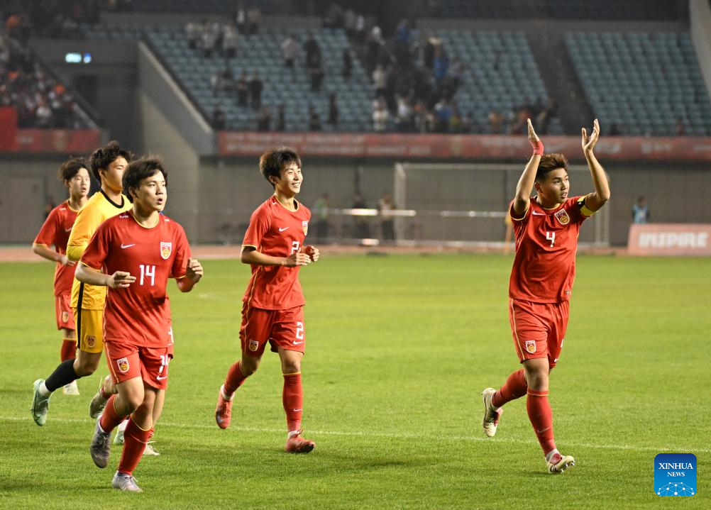 Lu Qizheng (1st R) of China U-16 team greets spectators after the match between China U-16 team and Saudi Arabia U-16 team at 2025 CFA Team China International Tournament in Hohhot, north China's Inner Mongolia Autonomous Region, May 28, 2025. (Xinhua/Bei He)