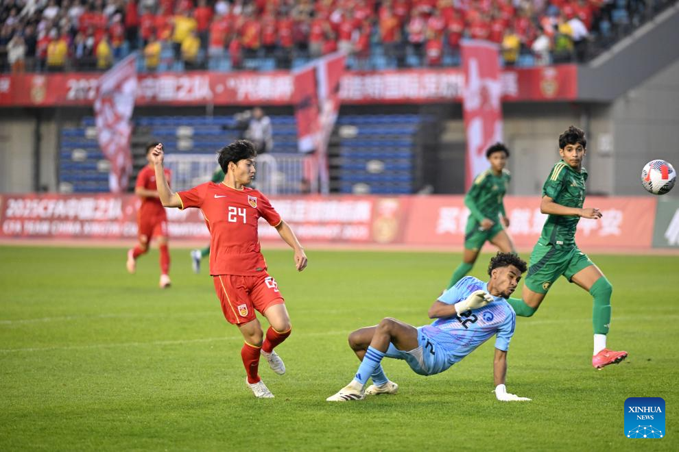 He Sifan (front L) of China U-16 team shoots to score during the match between China U-16 team and Saudi Arabia U-16 team at 2025 CFA Team China International Tournament in Hohhot, north China's Inner Mongolia Autonomous Region, May 28, 2025. (Xinhua/Bei He)