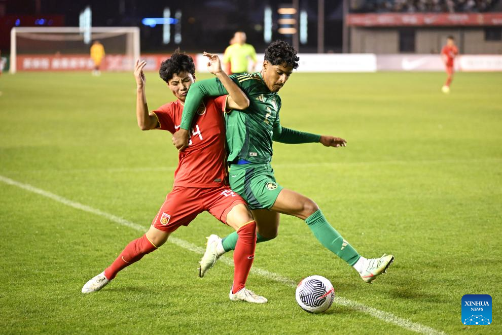 He Sifan (L) of China U-16 team vies with Jawad Alhashemalsayed of Saudi Arabia U-16 team during the match at 2025 CFA Team China International Tournament in Hohhot, north China's Inner Mongolia Autonomous Region, May 28, 2025. (Xinhua/Bei He)