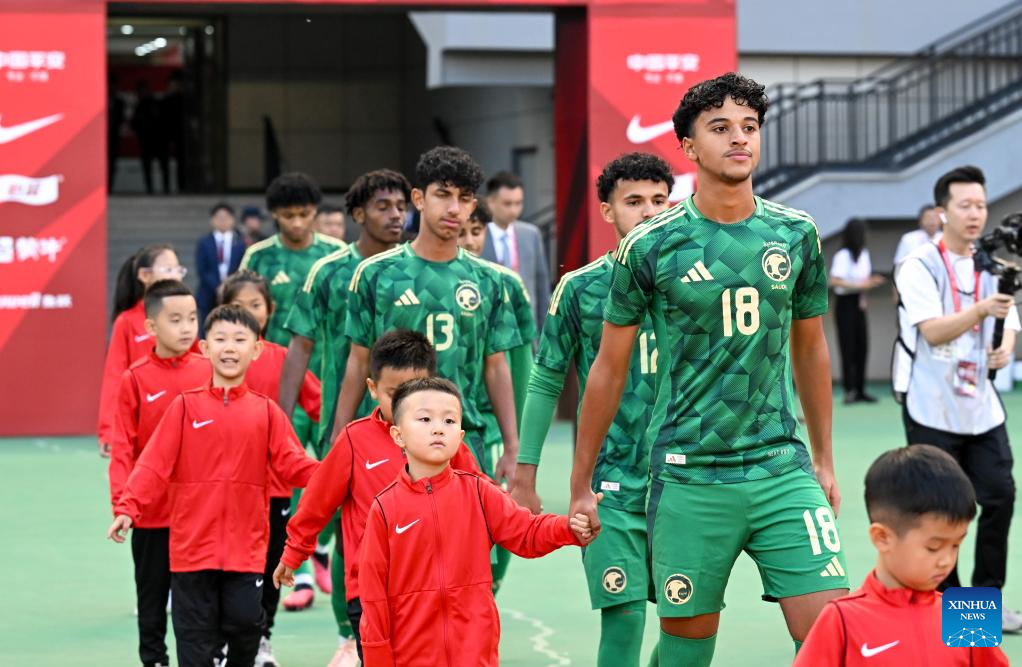 Faisal Bayomi (front R) of Saudi Arabia U-16 team walks in before the match between China U-16 team and Saudi Arabia U-16 team at 2025 CFA Team China International Tournament in Hohhot, north China's Inner Mongolia Autonomous Region, May 28, 2025. (Xinhua/Bei He)