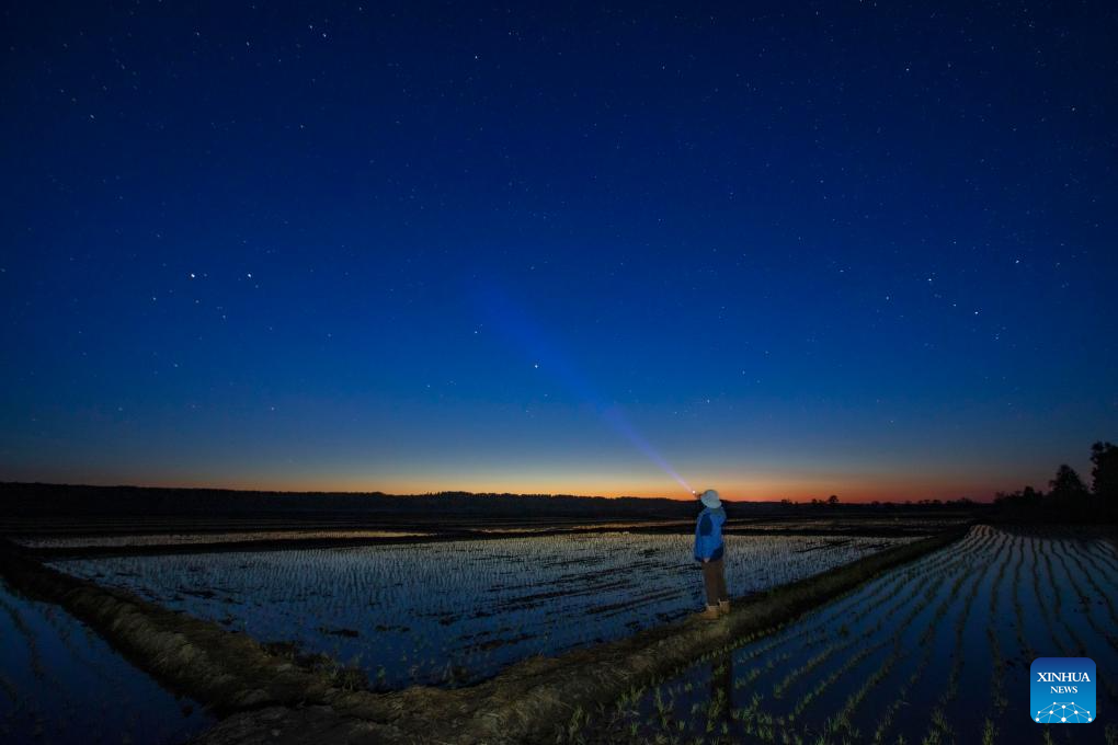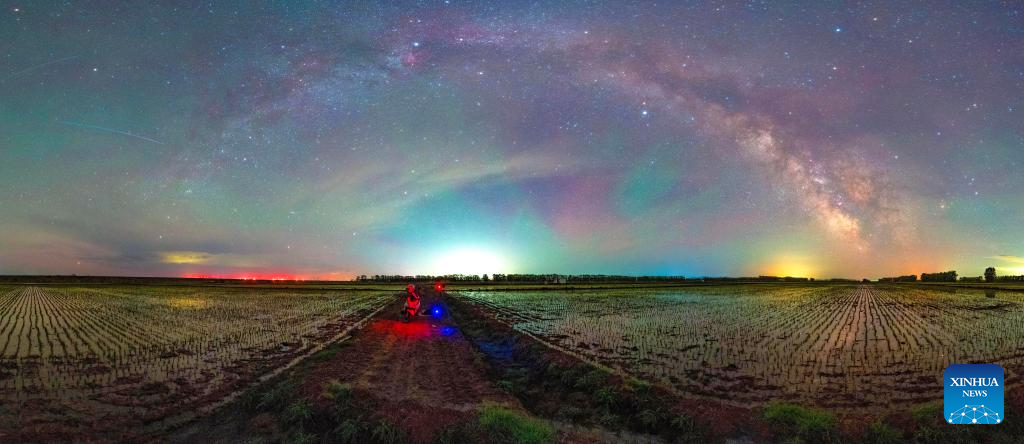 This photo shows a paddy rice field under the starry sky in Ning'an, Mudanjiang City, northeast China's Heilongjiang Province, May 24, 2025. With paddy rice transplanting largely concluded in Heilongjiang, the vast black soil in the province is now dressed in green, hinting the hope for a bountiful harvest. The Milky Way spreading across a starry sky is mirrored in waterlogged paddy rice fields, making a breathtaking scene in the early summer night. (Photo by Wang Baoxun/Xinhua)