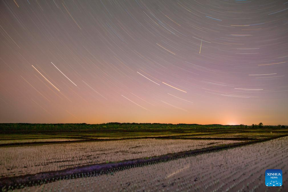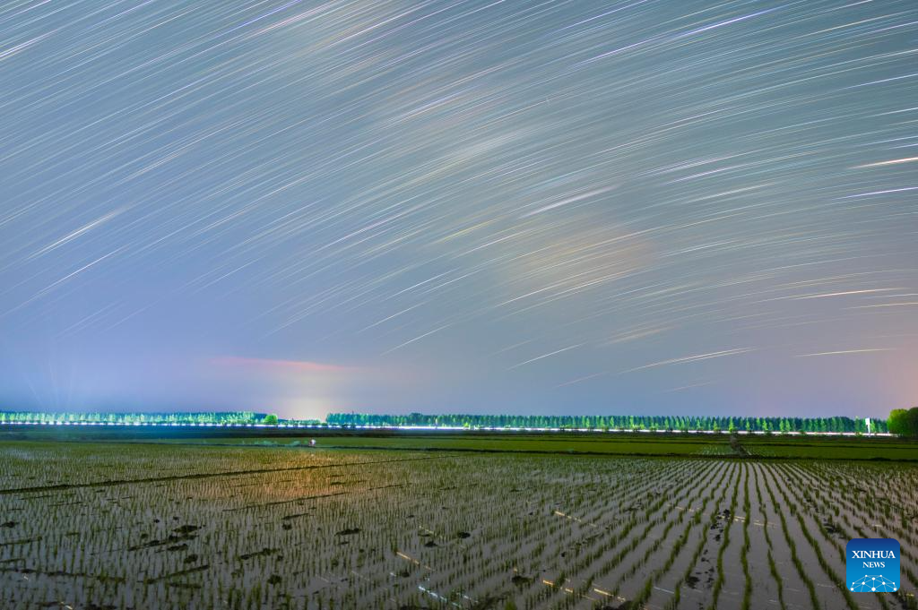This stack composite photo shows a paddy rice field under the starry sky in Youyi County of Shuangyashan City, northeast China's Heilongjiang Province, May 27, 2025. With paddy rice transplanting largely concluded in Heilongjiang, the vast black soil in the province is now dressed in green, hinting the hope for a bountiful harvest. The Milky Way spreading across a starry sky is mirrored in waterlogged paddy rice fields, making a breathtaking scene in the early summer night. (Photo by Han Yang/Xinhua)