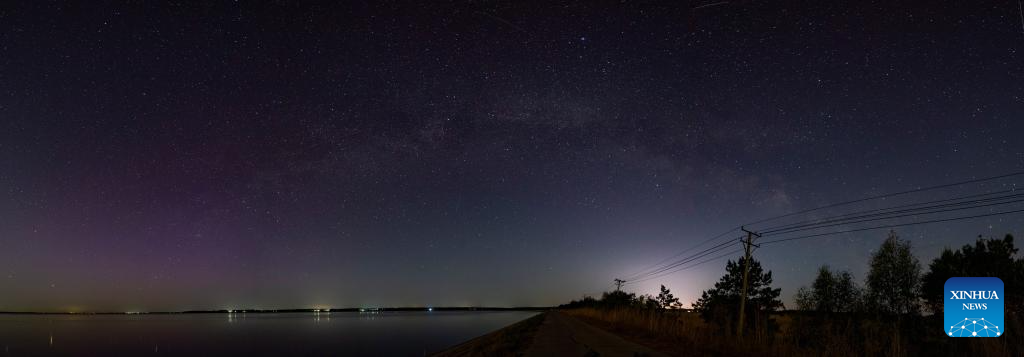 This stitched photo taken on June 1, 2025 shows a view of aurora and the Milky Way in the Wangkui County, northeast China's Heilongjiang Province. (Xinhua/Xie Jianfei)
