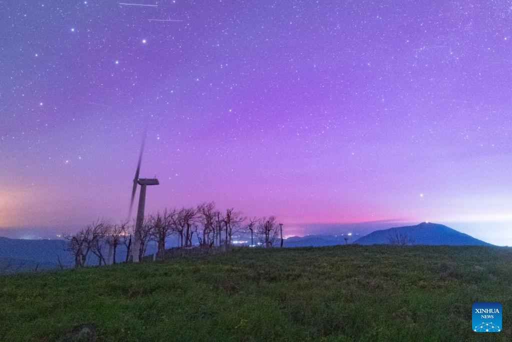 This photo taken on June 1, 2025 shows a view of aurora and a dashing meteor in Jixian County of Shuangyashan City, northeast China's Heilongjiang Province. (Photo by Han Yang/Xinhua)