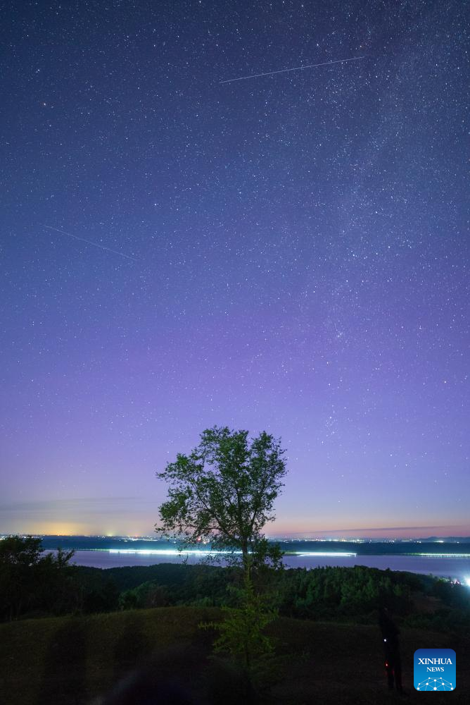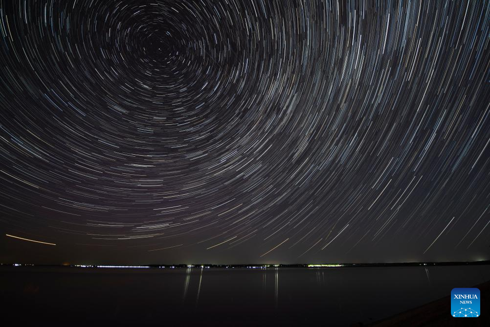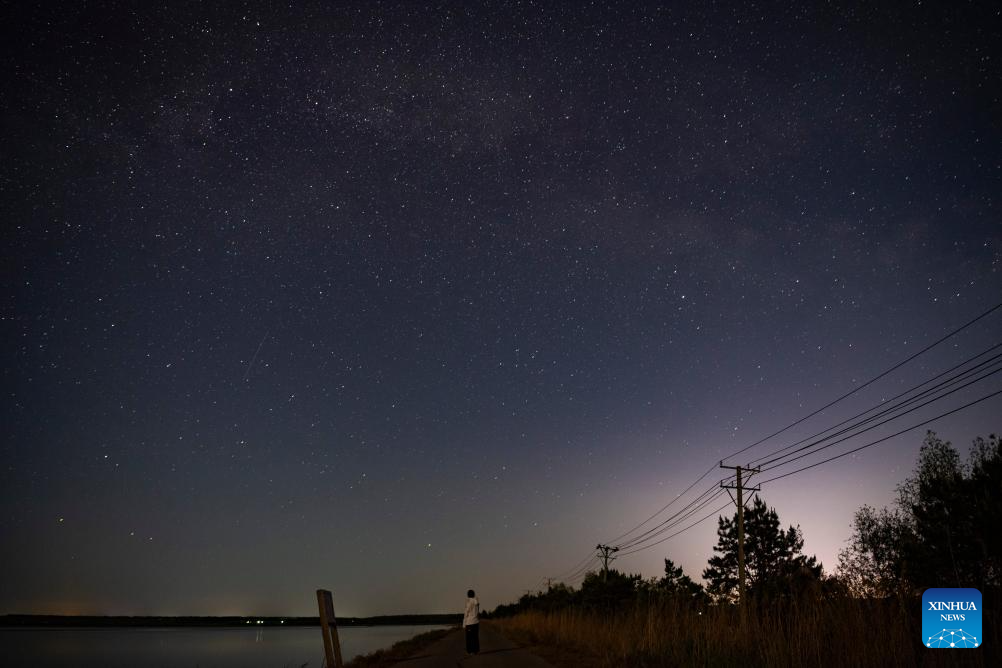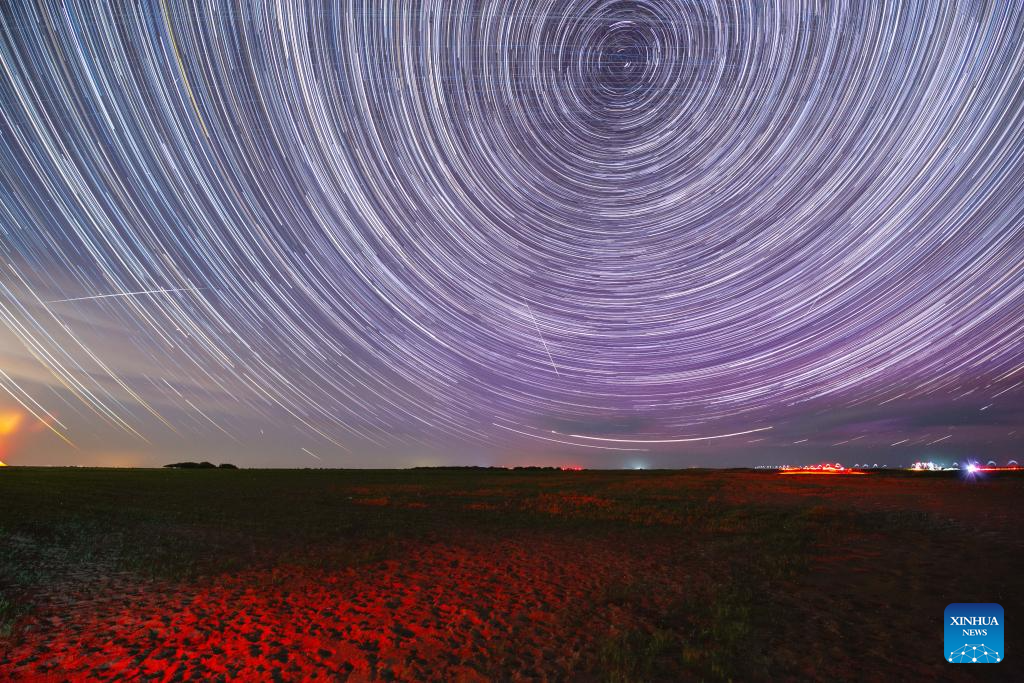 This stack composite photo shows a view of the starry sky in Wangkui County of northeast China's Heilongjiang Province, June 1, 2025. (Xinhua/Xie Jianfei)