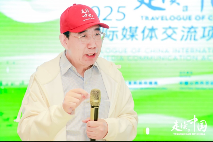 Wu Hailong, president of the China Public Diplomacy Association (CPDA), addresses journalists during the closing ceremony of the Travelogue of China visit to north China's Inner Mongolia Autonomous Region, May 16, 2025. (Photo/Courtesy of Travelogue of China)