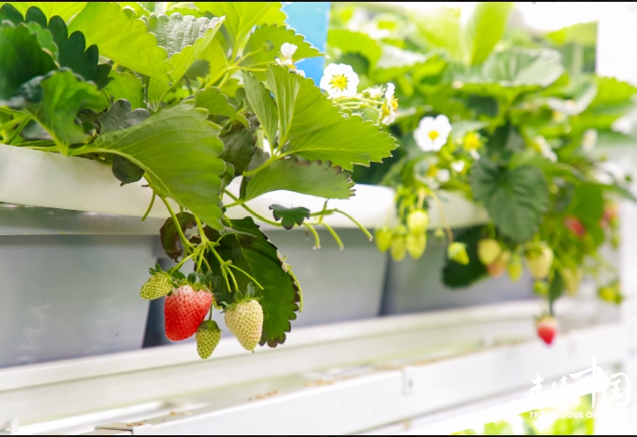 Photo shows lush strawberry plants at Qahar Right Wing Front Banner Plant Factory, north China's Inner Mongolia Autonomous Region, May 15, 2025. (Photo/Courtesy of Travelogue of China)
