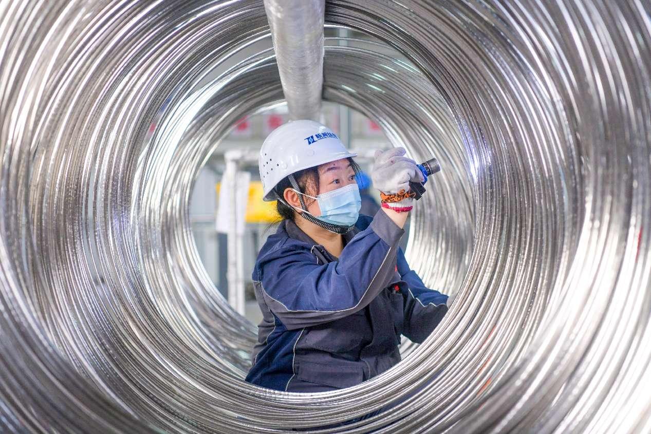 A worker checks the quality of titanium products in a workshop of Luoyang Hexin Titanium Co., Ltd. in central China's Henan province. (Photo by Zhang Yixi/People's Daily Online)