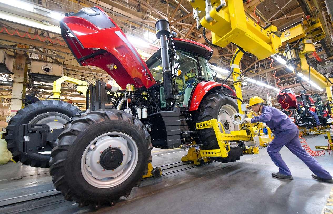 Tractors are assembled in a workshop of YTO Group Corporation, an agricultural machinery supplier based in Luoyang, central China's Henan province. (Photo by Zhang Yixi/People's Daily Online)