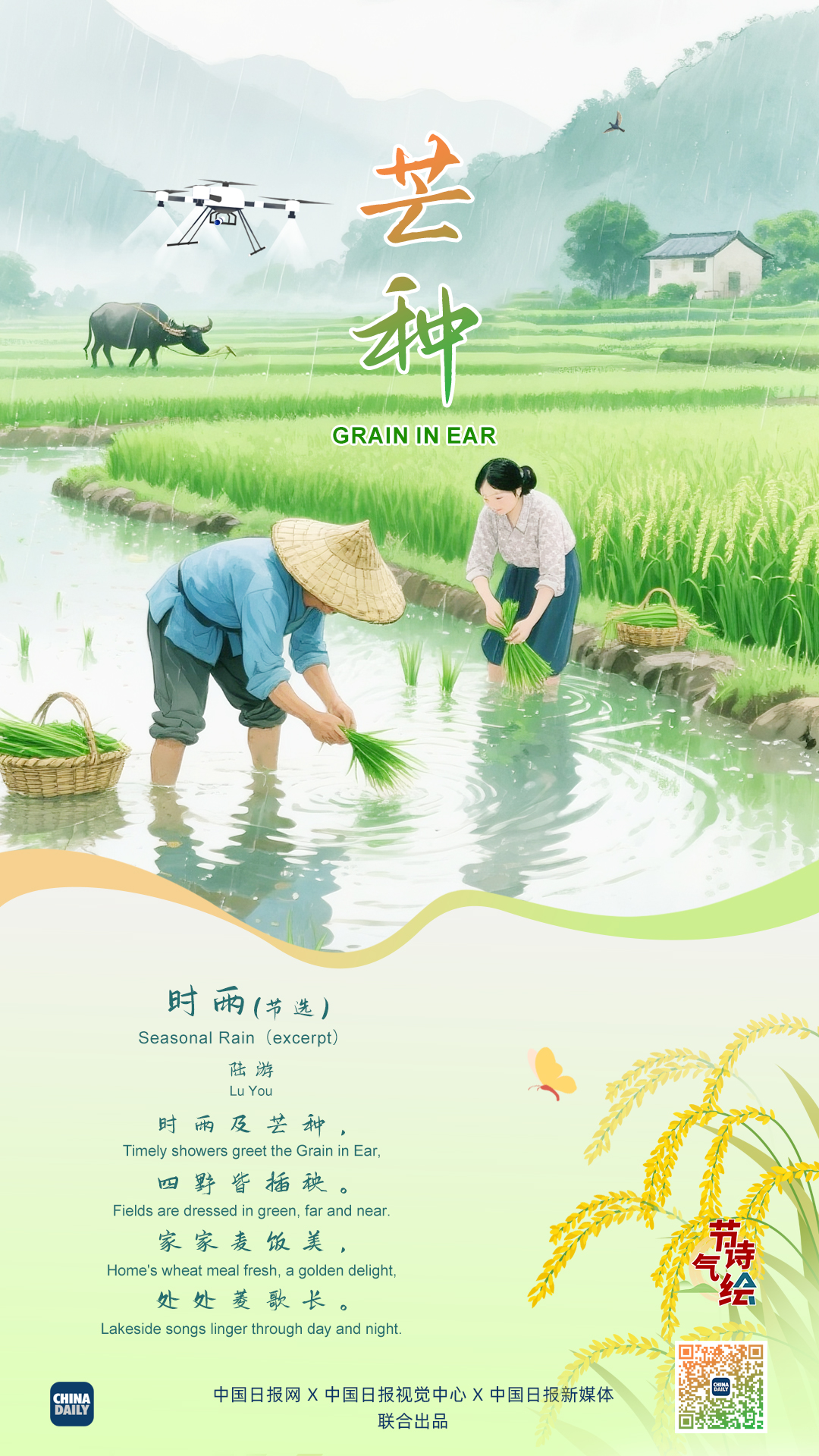 Grain in Ear marks one of the busiest seasons for farmers. In the north, wheat fields turn golden-ripe, while southern lands of rice are sown with scope. Song Dynasty (960-1279) poet Lu You beautifully captured this moment in "Seasonal Rain": Timely showers greet the Grain in Ear; Fields are dressed in green, far and near. This Grain in Ear, let us all sow our own seeds of hope.