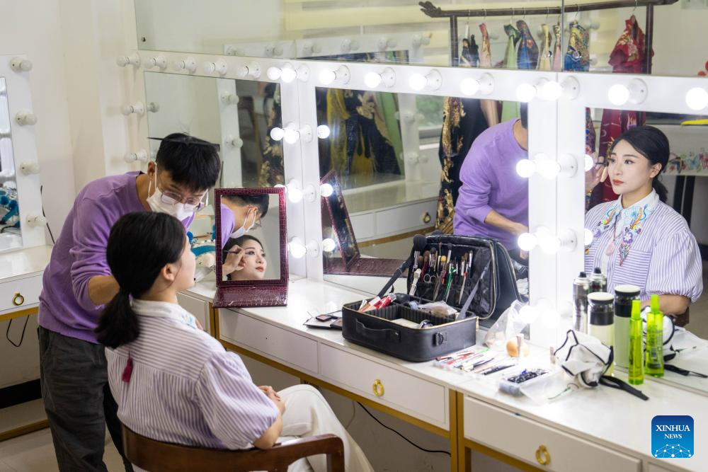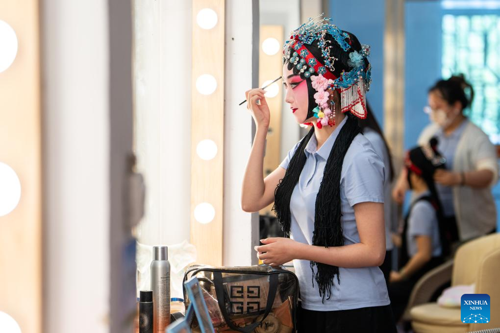 Actress Lei Lili puts on makeup before a performance at the dressing room of the Hunan Kunqu Opera Troupe in Beihu District of Chenzhou City in central China's Hunan Province, June 4, 2025.