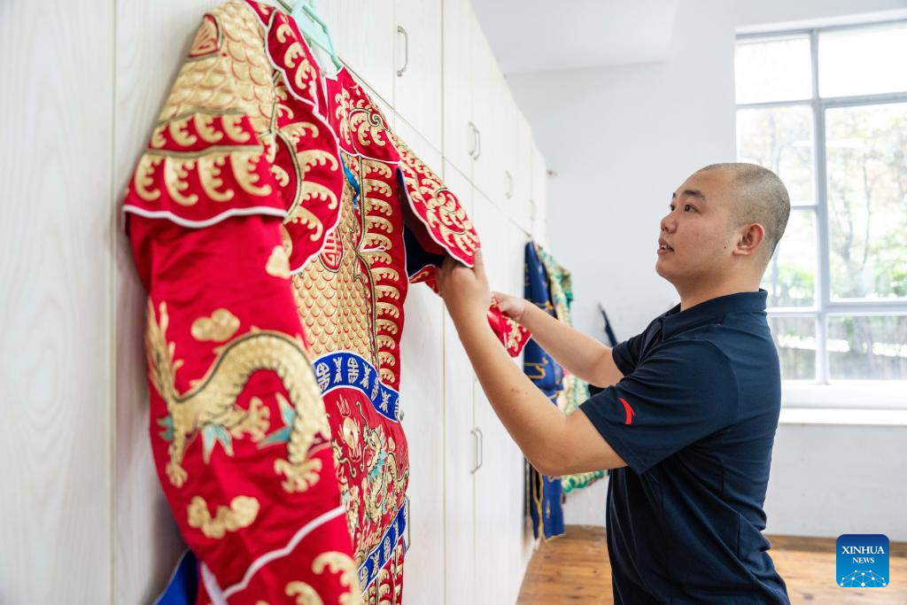 Actor Cai Junkai tidies up the costume at the practice room of the Hunan Kunqu Opera Troupe in Beihu District of Chenzhou City in central China's Hunan Province, June 4, 2025.
