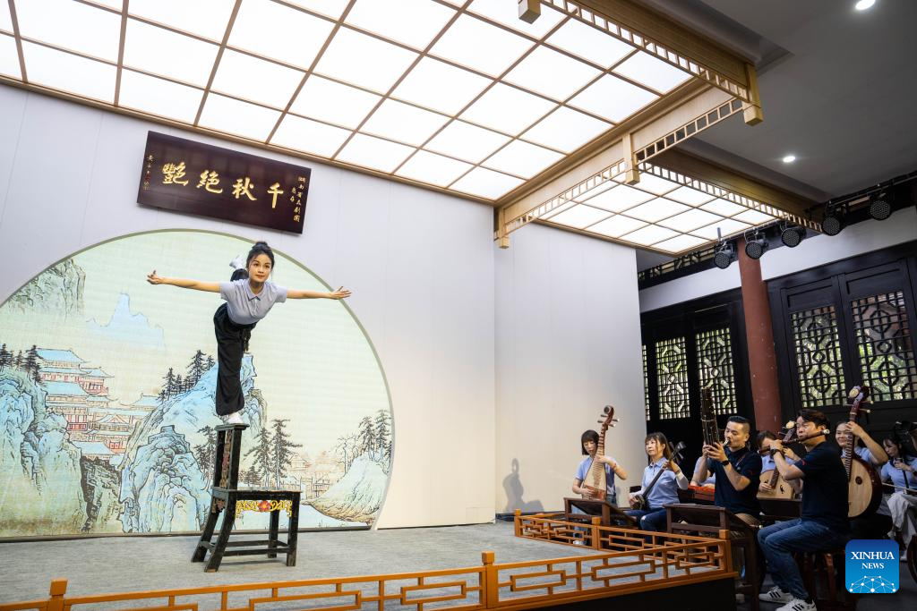 Actress Xu Ying practices balancing skill at a small theater of the Hunan Kunqu Opera Troupe in Beihu District of Chenzhou City in central China's Hunan Province, June 4, 2025.