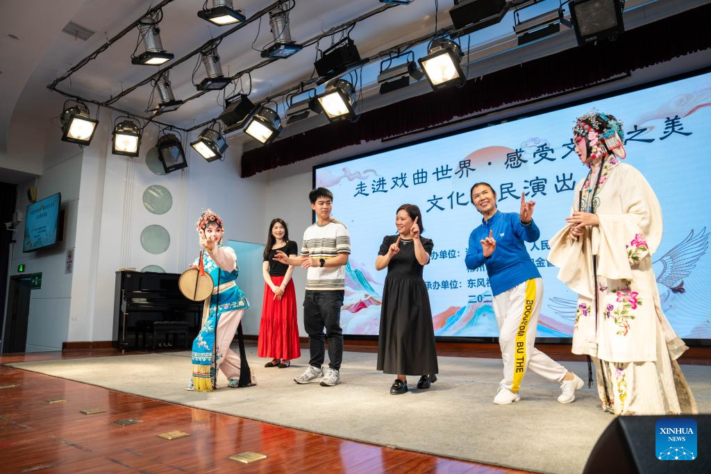 Actresses from the Hunan Kunqu Opera Troupe lead the fans as they try themselves with Kunqu Opera performance at a community in Beihu District of Chenzhou City in central China's Hunan Province, June 4, 2025.