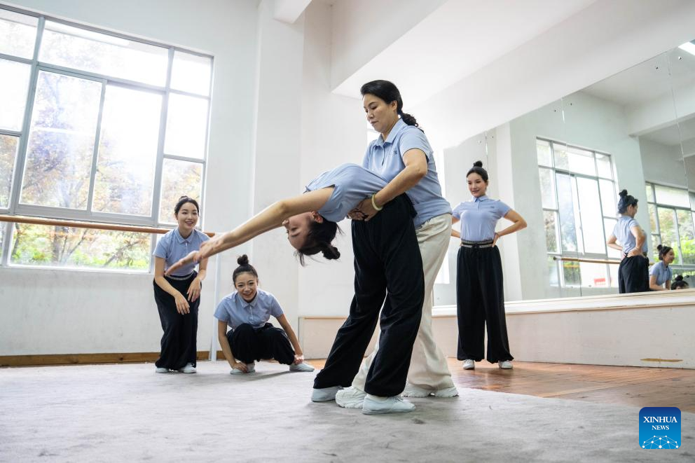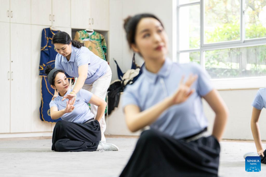 Actress Wang Limei (R, back) helps a young actress take basic training at the practice room of the Hunan Kunqu Opera Troupe in Beihu District of Chenzhou City in central China's Hunan Province, June 4, 2025.