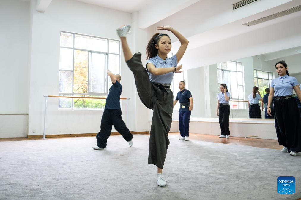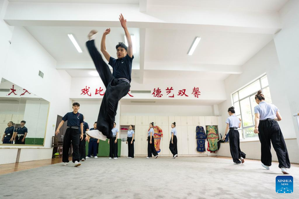 Actor Liao Maoxin (front) takes basic training at the practice room of the Hunan Kunqu Opera Troupe in Beihu District of Chenzhou City in central China's Hunan Province, June 4, 2025.