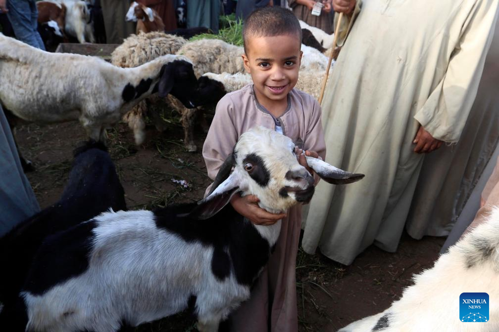 A boy is pictured with a sheep at a sheep market before the upcoming Eid al-Adha on the outskirts of Cairo, Egypt, on June 4, 2025. (Xinhua/Ahmed Gomaa)