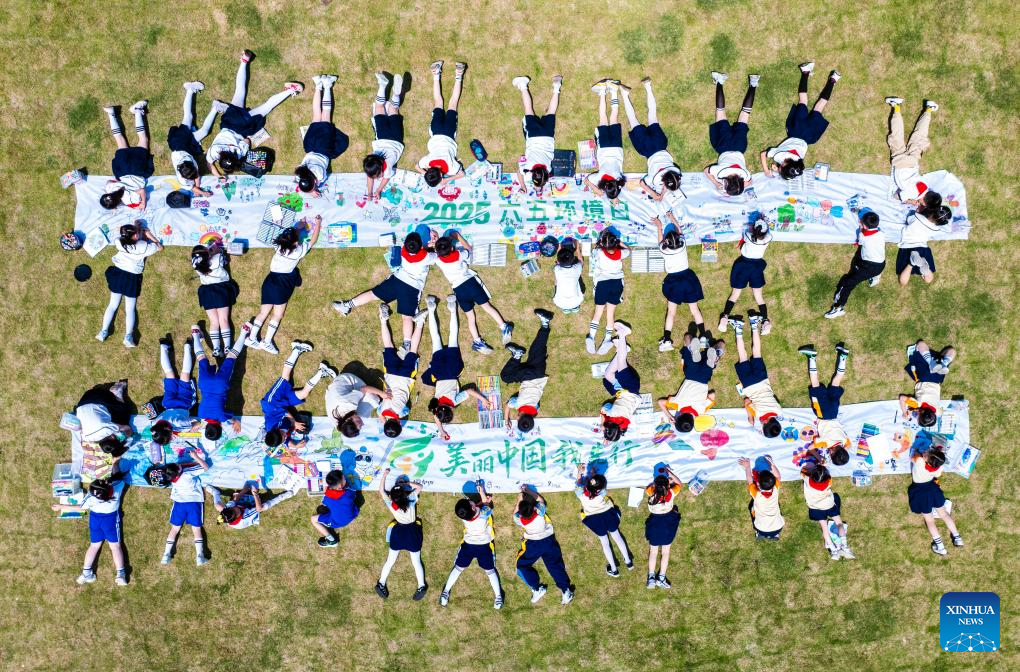 An aerial drone photo taken on June 4, 2025 shows primary school students painting during an environmental protection-themed event in Xinghua City, east China's Jiangsu Province.