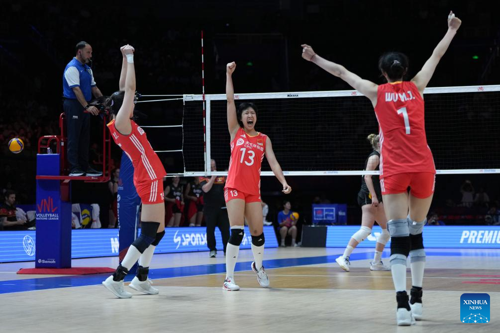 Host China kicked off its Volleyball Nations League (VNL) Beijing leg in style with a straight-set victory over Belgium on Wednesday, winning 25-18, 27-25, 25-13 at the National Indoor Stadium. (Xinhua/Ju Huanzong)