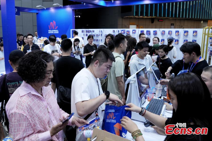 Consumers learn about volleyball-related products at the official merchandise store of the FIVB Volleyball Nations League (VNL) at the National Indoor Stadium in Beijing, China, June 8, 2025. (China News Service/Zhang Xiangyi)