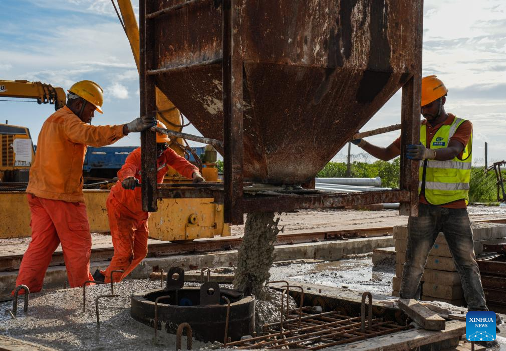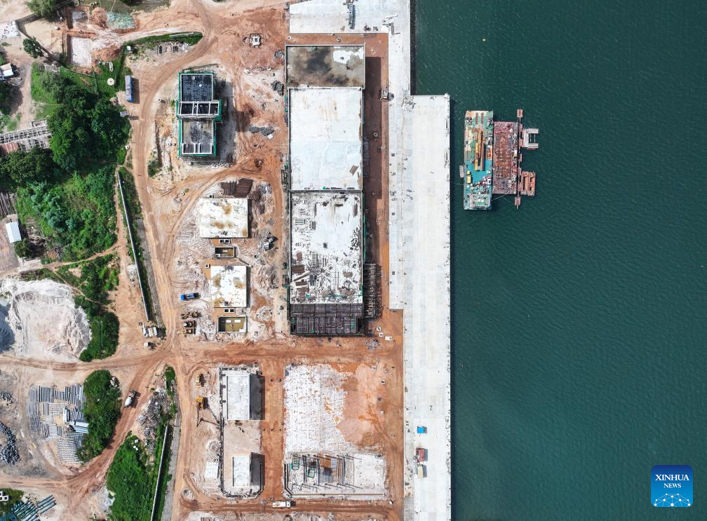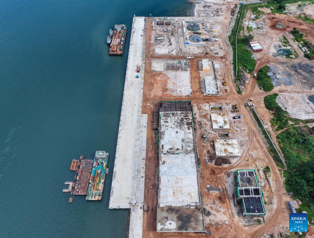 People work at the construction site of the Kilwa Fishing Harbor near Kilwa Kisiwani, Tanzania, on April 23, 2025. The project, constructed by China Harbor Engineering Company Ltd (CHEC), a leading Chinese construction company, is Tanzania's first modern large-scale fishing harbor. Covering about 5.6 hectares, it is designed to handle 60,000 tonnes of fish annually and can dock deep-sea fishing vessels, according to Chen Zhifeng, vice project manager of the CHEC Tanzania maritime project department. (Xinhua/Li Yahui)