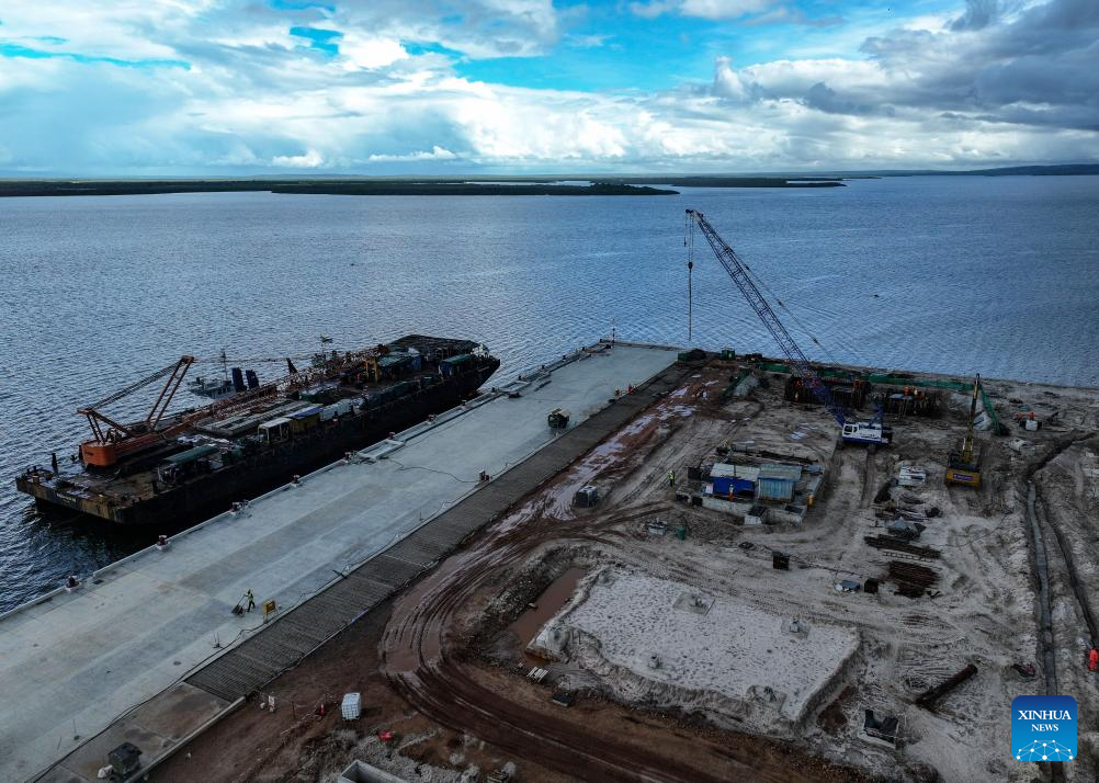 An aerial drone photo taken on April 23, 2025 shows the Kilwa Fishing Harbor under construction near Kilwa Kisiwani, Tanzania. The project, constructed by China Harbor Engineering Company Ltd (CHEC), a leading Chinese construction company, is Tanzania's first modern large-scale fishing harbor. Covering about 5.6 hectares, it is designed to handle 60,000 tonnes of fish annually and can dock deep-sea fishing vessels, according to Chen Zhifeng, vice project manager of the CHEC Tanzania maritime project department. (Xinhua/Li Yahui)