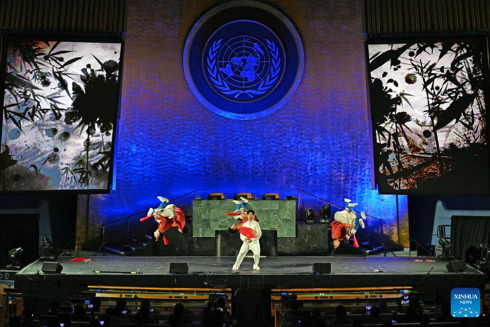 Actors perform martial arts during an art performance at the UN headquarters in New York, June 9, 2025. A series of events was held on Monday at UN Headquarters in New York to commemorate the first anniversary of the International Day for Dialogue among Civilizations.