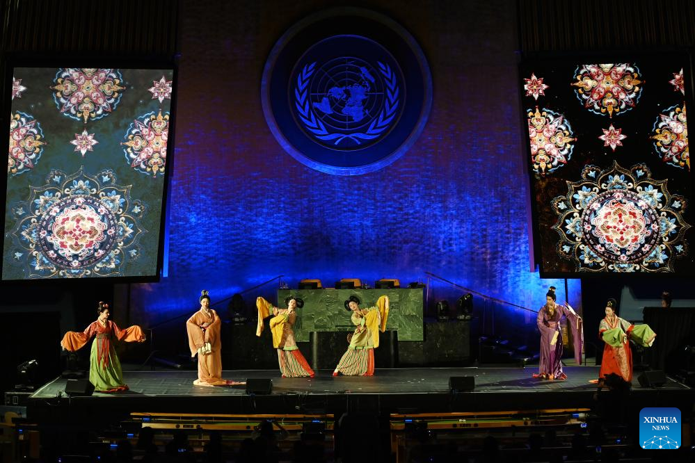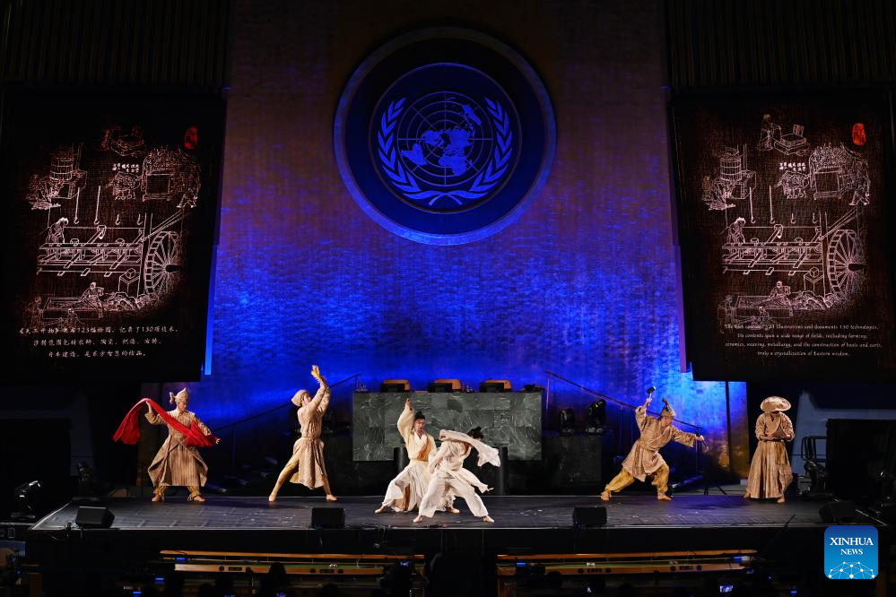 A highlight from the dance drama "The Exploitation of Nature's Works" ("Tian Gong Kai Wu") is staged during an art performance at the UN headquarters in New York, June 9, 2025. A series of events was held on Monday at UN Headquarters in New York to commemorate the first anniversary of the International Day for Dialogue among Civilizations.