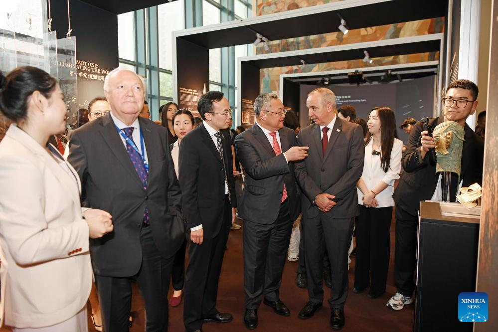 Guests visit an exhibition themed "Light of the Sun -- Ancient Shu Civilization and the World" at the UN headquarters in New York, June 9, 2025. A series of events was held on Monday at UN Headquarters in New York to commemorate the first anniversary of the International Day for Dialogue among Civilizations.