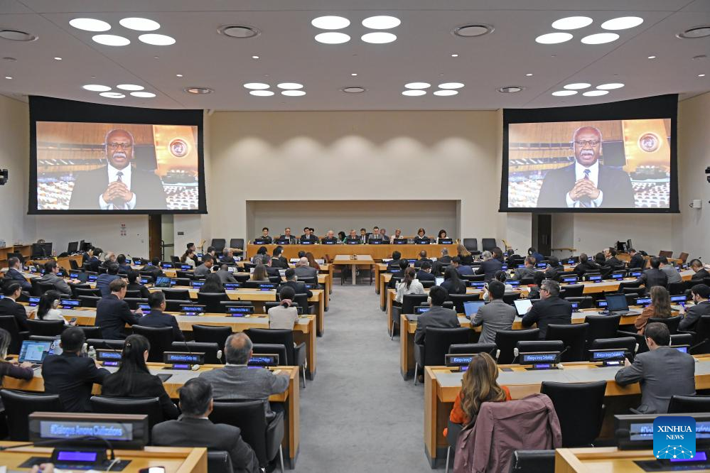 UN General Assembly President Philemon Yang delivers a video message during a thematic dialogue to mark the first anniversary of the International Day for Dialogue among Civilizations at the UN headquarters in New York, June 9, 2025. A series of events was held on Monday at UN Headquarters in New York to commemorate the first anniversary of the International Day for Dialogue among Civilizations.