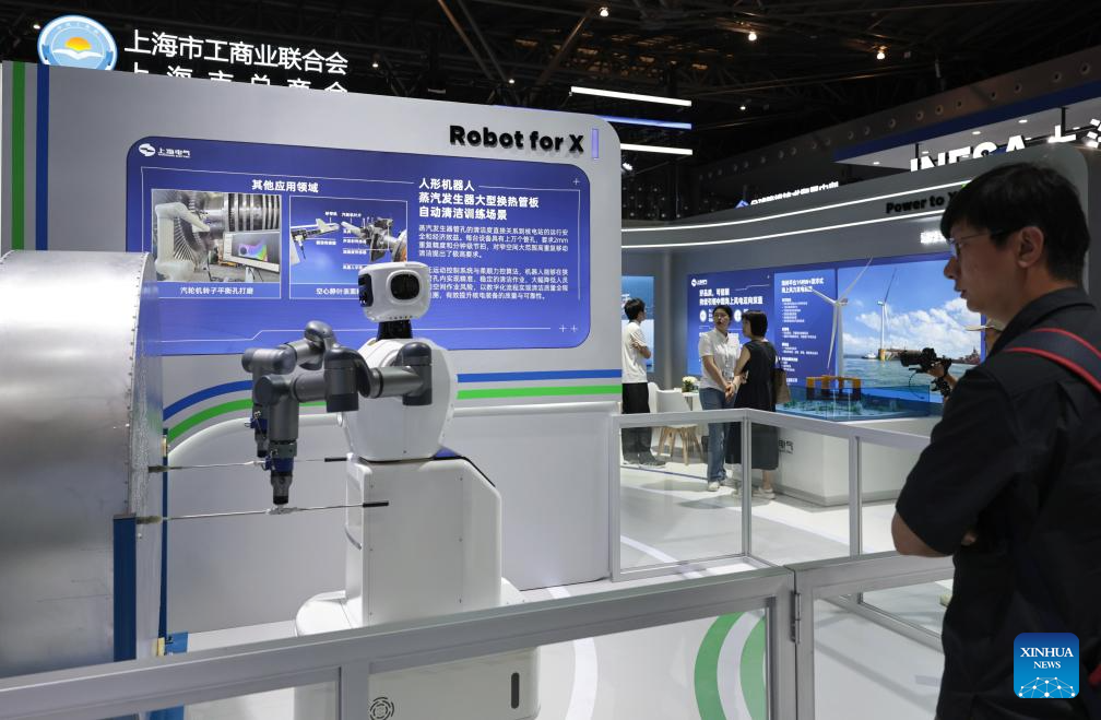 A visitor watches a humanoid cleaning robot during the 11th China (Shanghai) International Technology Fair (CSITF) in east China's Shanghai, June 11, 2025. The 11th CSITF kicked off here on Wednesday. With an exhibition area covering 35,000 square meters, this year's fair features four themed exhibition areas, a trading service area and a trading facilitation events area. Some 1,000 exhibitors from nearly 20 countries and regions showcased their innovative achievements here. (Xinhua/Fang Zhe)