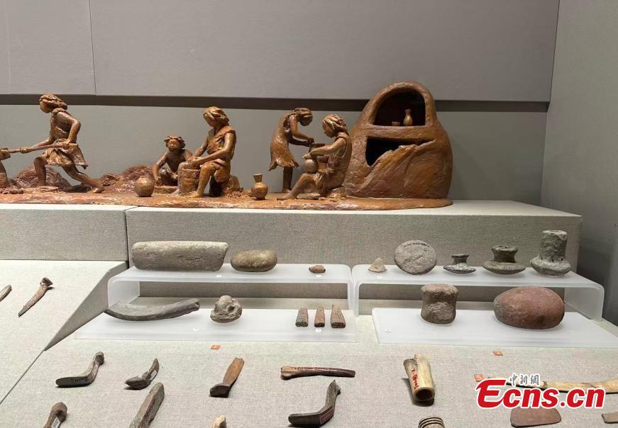 Photo taken on June 11, 2025, shows bone needles and other artifacts at the Dahecun Site Museum in Zhengzhou, central China's Henan Province. (China News Service/Wang Jianing)