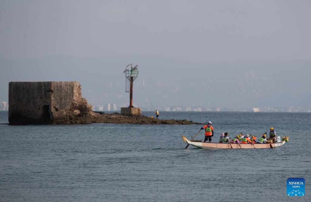 People paddle dragon boats during a dragon boat event in the northern Israeli city of Acre, June 12, 2025. A Chinese cultural event centered on dragon boat racing was held on Thursday in the ancient Israeli city of Acre. More than 300 participants competed in the traditional boat races along the Mediterranean coast. (Xinhua/Chen Junqing)