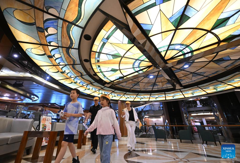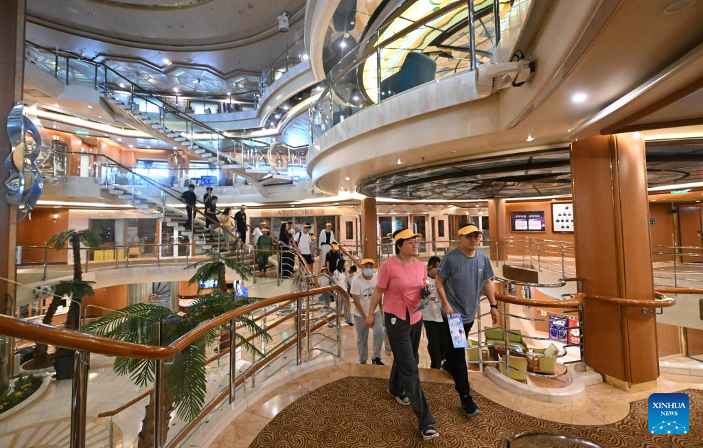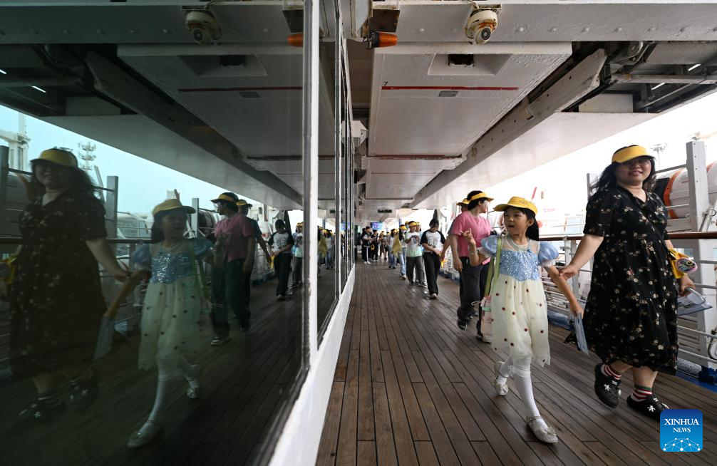 Visitors enjoy themselves aboard the cruise ship Dream at Tianjin International Cruise Home Port in north China's Tianjin Municipality, June 14, 2025. The cruise ship Dream opened for public visit here on Saturday as part of the ongoing 3rd Tianjin International Shipping Industry Expo. (Xinhua/Zhao Zishuo)