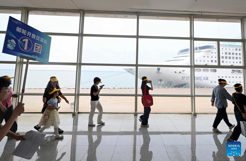Visitors are pictured aboard the cruise ship Dream at Tianjin International Cruise Home Port in north China's Tianjin Municipality, June 14, 2025. The cruise ship Dream opened for public visit here on Saturday as part of the ongoing 3rd Tianjin International Shipping Industry Expo. (Xinhua/Zhao Zishuo)