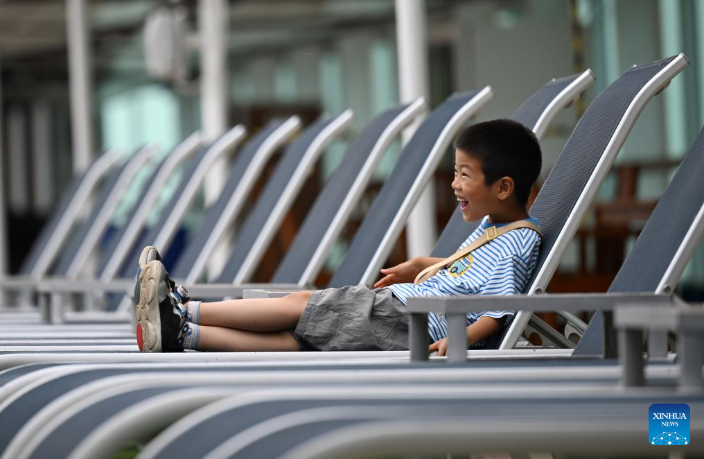 A young visitor enjoys himself aboard the cruise ship Dream at Tianjin International Cruise Home Port in north China's Tianjin Municipality, June 14, 2025. The cruise ship Dream opened for public visit here on Saturday as part of the ongoing 3rd Tianjin International Shipping Industry Expo. (Xinhua/Zhao Zishuo)