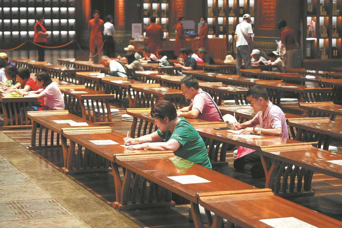 Visitors copy passages from The Analects of Confucius in the grand lecture hall of Nishan Sacred Land in Qufu, Shandong province, on May 21. XU SUHUI/XINHUA