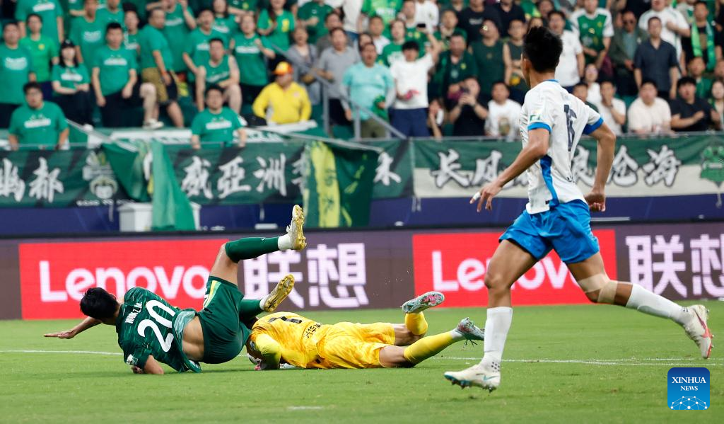 Wang Ziming (L) of Beijing Guoan vies with Li Hao (C), goalkeeper of Qingdao West Coast during the 6th round match between Beijing Guoan and Qingdao West Coast at the 2025 season Chinese Football Super League (CSL) in Beijing, capital of China, June 17, 2025. (Xinhua/Wang Lili)