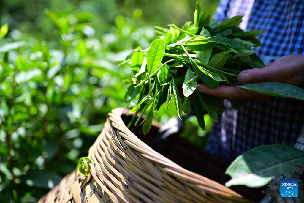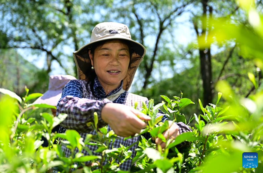 A farmer picks tea leaves in Houkeng Village of Huangshan, east China's Anhui Province, April 15, 2025.