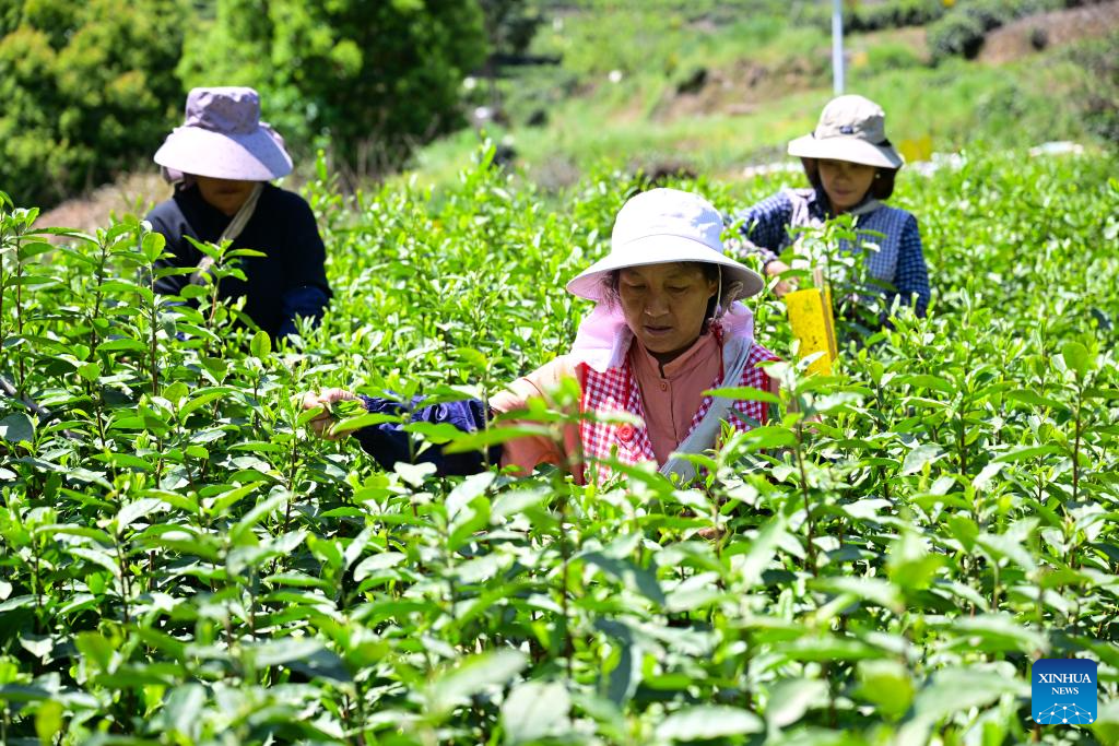 Farmers pick tea leaves in Houkeng Village of Huangshan, east China's Anhui Province, April 15, 2025.
