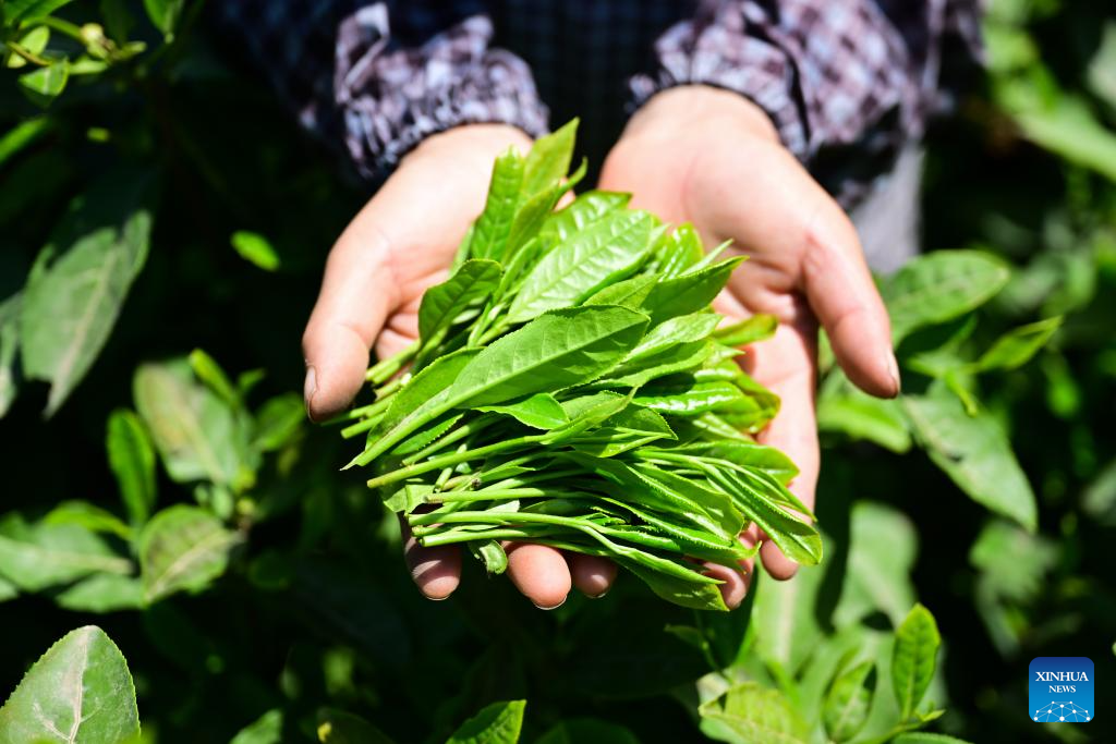 A farmer shows newly-picked tea leaves in Houkeng Village of Huangshan, east China's Anhui Province, April 15, 2025.