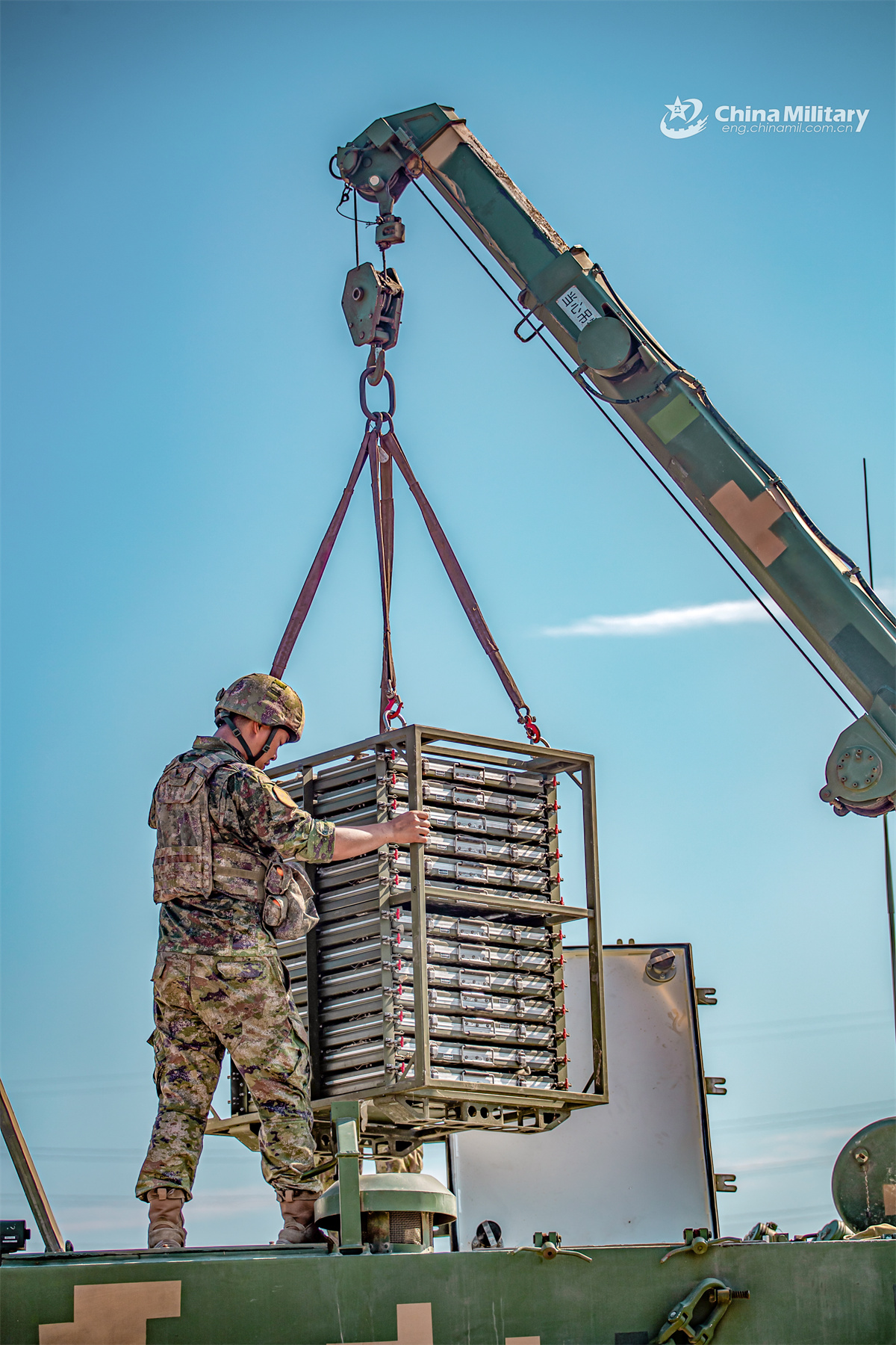 A soldier assigned to a brigade under the Chinese PLA 73rd Group Army hoist and load shells onto the predetermined position of a launching device during an ammunition hoisting operation. (eng.chinamil.com.cn/Photo by Xiao Zubin)