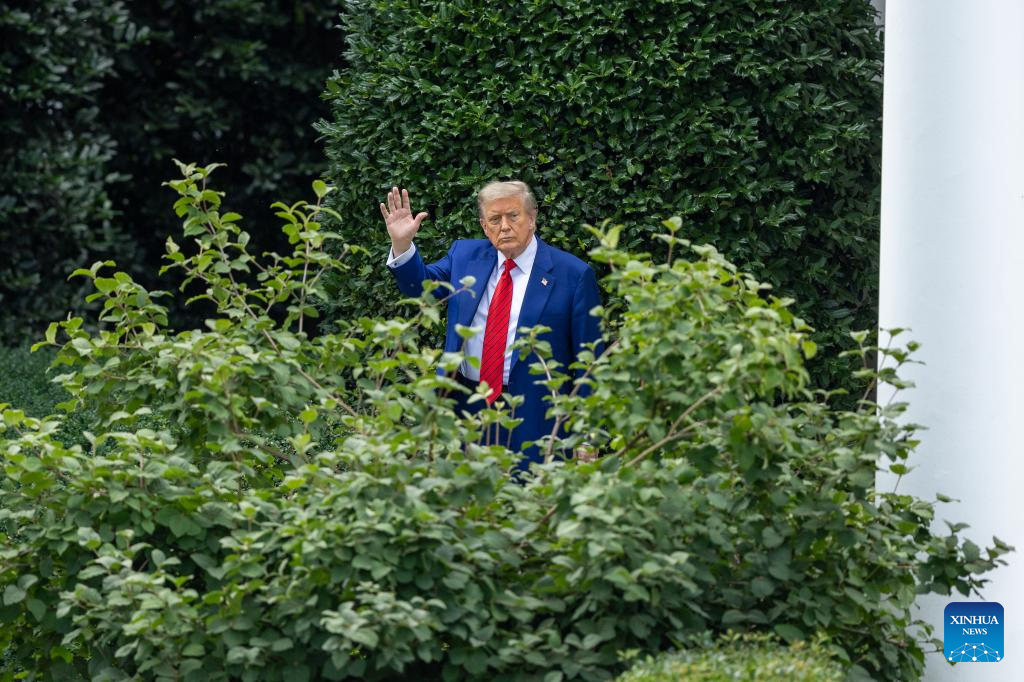 U.S. President Donald Trump waves to the press as he walks toward the South Lawn to board Marine One at the White House in Washington, D.C., the United States, on June 20, 2025. Trump said Friday it will be difficult to request Israel stop its airstrikes in Iran, even as he pursues a diplomatic solution to end the conflict. (Xinhua/Hu Yousong)