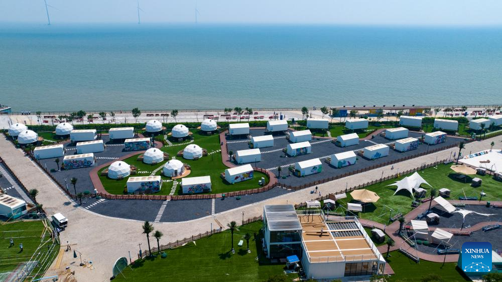 A drone photo taken on June 21, 2025 shows a camping base at a seaside park in Binhai New Area in north China's Tianjin. In recent years, Binhai New Area in Tianjin has made great efforts to protect ecological environment and upgraded the layout of parks. Several seaside landmarks in Binhai have become popular tourist destinations. (Xinhua/Zhao Zishuo)