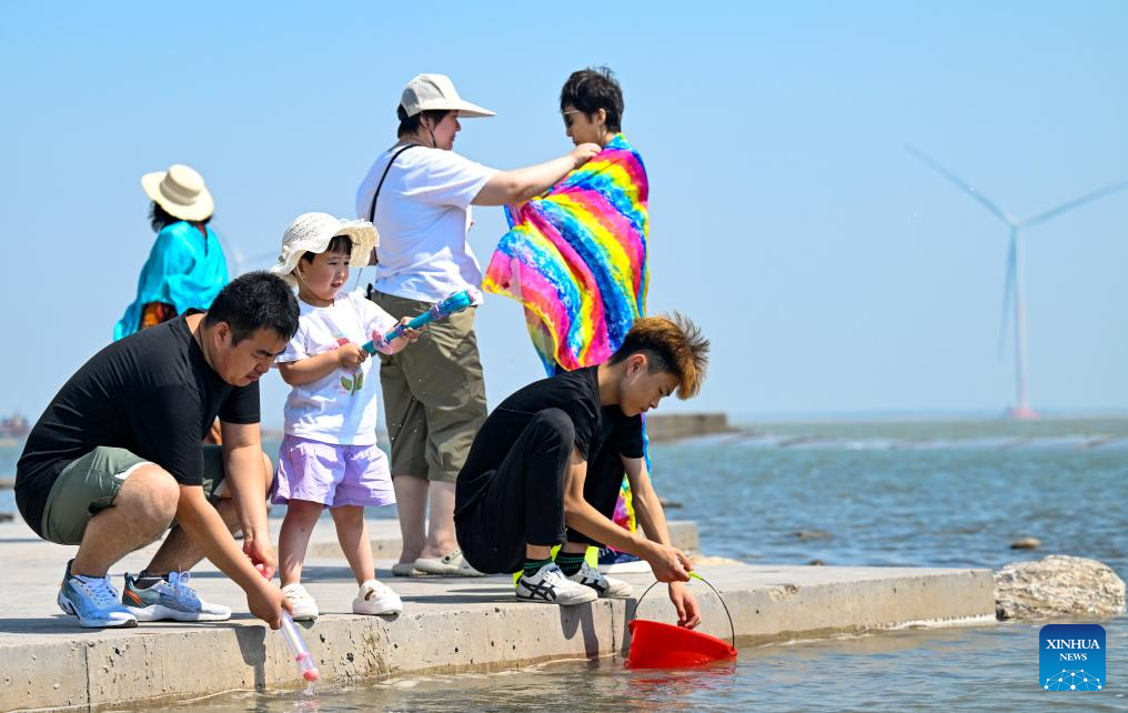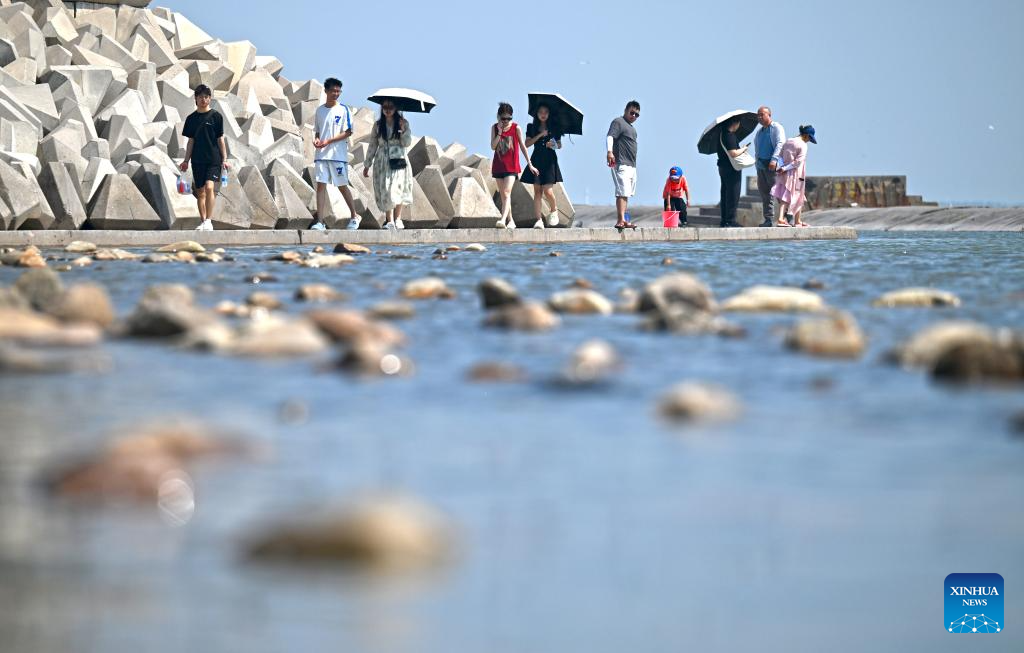 Tourists visit a seaside park in Binhai New Area in north China's Tianjin, June 21, 2025. In recent years, Binhai New Area in Tianjin has made great efforts to protect ecological environment and upgraded the layout of parks. Several seaside landmarks in Binhai have become popular tourist destinations. (Xinhua/Zhao Zishuo)