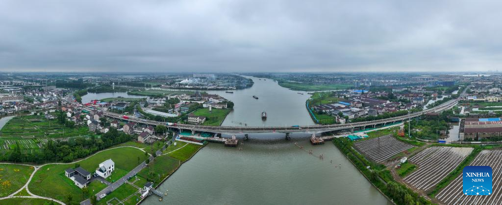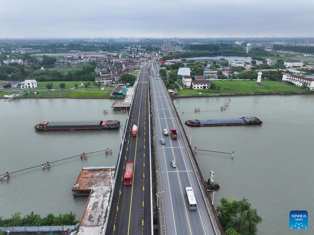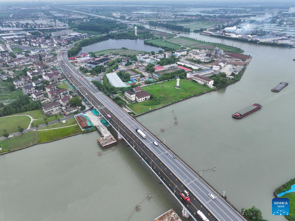 An aerial drone photo taken on June 23, 2025 shows a view of the Pingwang Bridge in Wujiang District of Suzhou City, east China's Jiangsu Province.