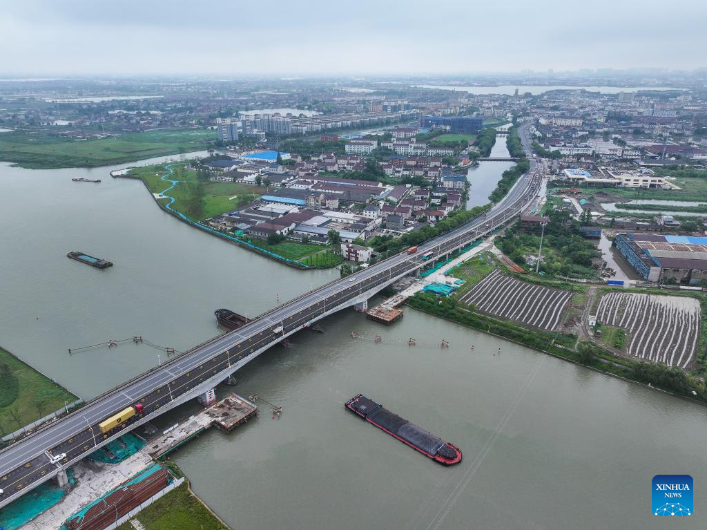 The left lanes of the newly-built Pingwang Bridge, a project of the east part of the Chang-Hu-Shen (Changxin-Huzhou-Shanghai) navigation channel (Jiangsu section) improvement project, was officially opened to traffic on Monday. (Xinhua/Ji Chunpeng)