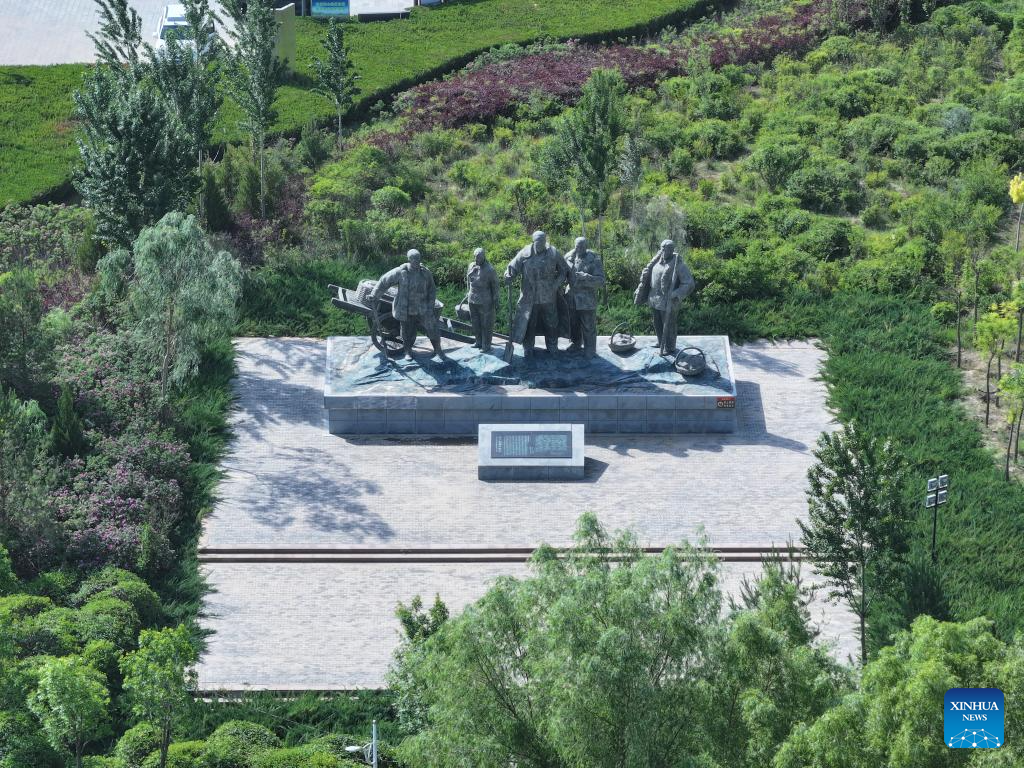 An aerial drone photo taken on May 28, 2025 shows a commemorative sculpture near the main canal in Linhe District of Bayannur, north China's Inner Mongolia Autonomous Region. (Xinhua/Ma Jinrui)
